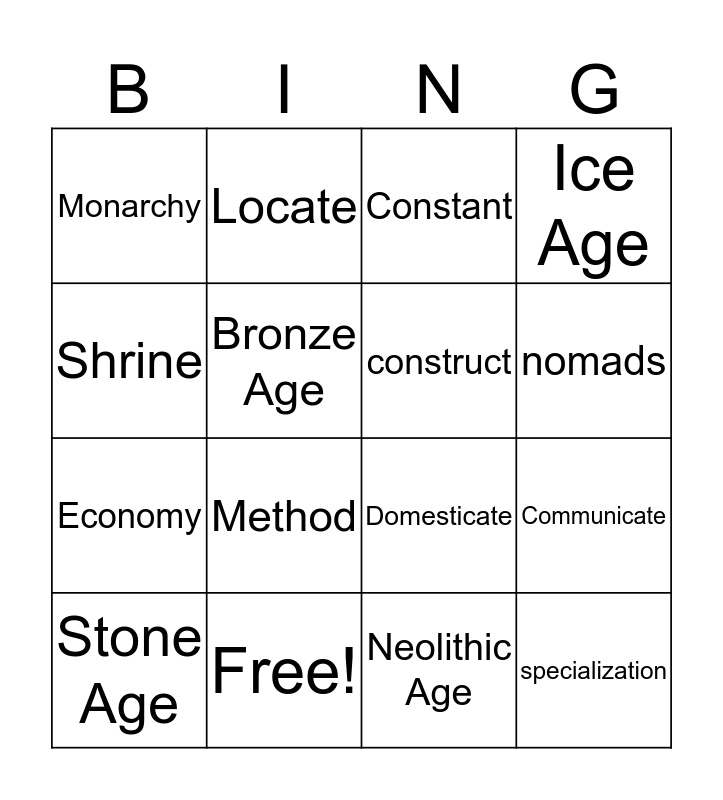 This bingo card has 16 words: Free!, Communicate, Constant, Monarchy, Economy, Locate, Domesticate, Neolithic Age, Shrine, Bronze Age, Stone Age, Ice Age, Method, nomads, construct and specialization.