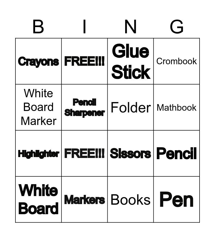 This bingo card has 20 words: Pencil, Eraser, Glue Stick, Lunchbox, White Board, White Board Marker, Markers, Crayons, Highlighter, FREE!!!, FREE!!!, Sissors, Pencil Sharpener, Pen, Folder, Notebook, Mathbook, Crombook, Books and Sticky Notes.