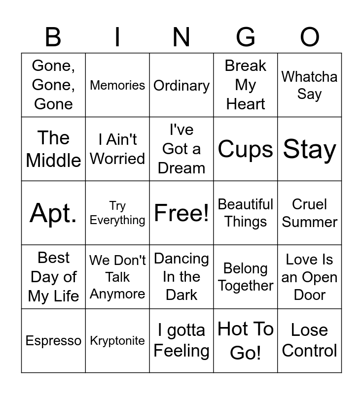 This bingo card has a free space and 29 words: Espresso, That's So True, Try Everything, Bloodline, Gone, Gone, Gone, Ordinary, I Ain't Worried, We Don't Talk Anymore, Beautiful Things, Kryptonite, Cruel Summer, Lose Control, I gotta Feeling, Hot To Go!, Stay, Azizam, Dancing In the Dark, Best Day of My Life, Whatcha Say, Apt., Belong Together, You're Welcome, Cups, The Middle, Break My Heart, Memories, Love Is an Open Door, I've Got a Dream and All Star.