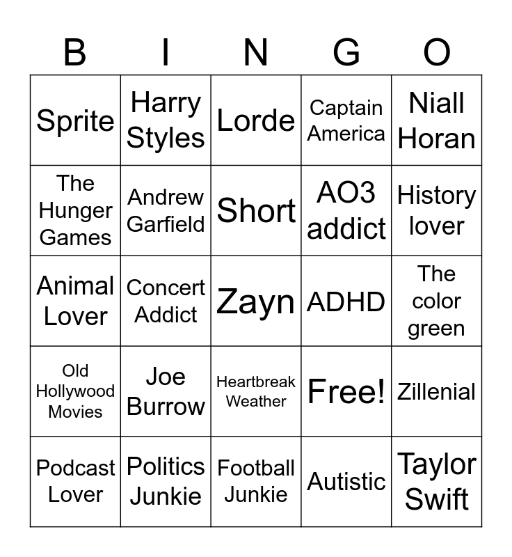 This bingo card has 25 words: Joe Burrow, Football Junkie, Short, Podcast Lover, Niall Horan, Sprite, The Hunger Games, Harry Styles, ADHD, Heartbreak Weather, AO3 addict, Animal Lover, Free!, Zillenial, Andrew Garfield, Taylor Swift, The color green, Lorde, History lover, Concert Addict, Zayn, Politics Junkie, Old Hollywood Movies, Captain America and Autistic.
