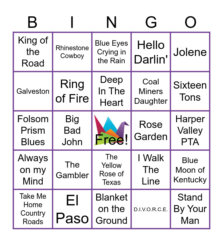 This bingo card has a free space and 30 words: Take Me Home Country Roads, The Devil Went Down To Georgia, Deep In The Heart, Abilene, Jolene, King of the Road, Rhinestone Cowboy, The Yellow Rose of Texas, Rose Garden, Stand By Your Man, Always on my Mind, Ring of Fire, Here You Come Again, D.I.V.O.R.C.E., Blue Moon of Kentucky, By The Time I Get to Phoenix, Big Bad John, Blanket on the Ground, I Walk The Line, Sixteen Tons, Folsom Prism Blues, El Paso, Blue Eyes Crying in the Rain, Coal Miners Daughter, Harper Valley PTA, Galveston, The Gambler, The Most Beautiful Girl, Hello Darlin' and Your Cheating Heart.