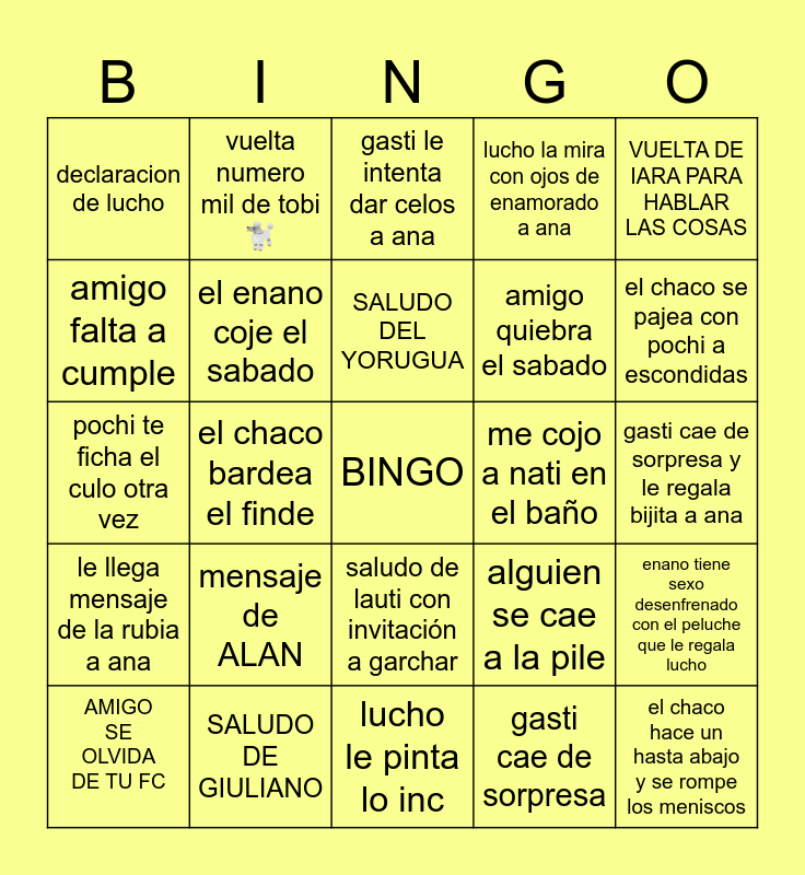 This bingo card has a free space and 24 words: mensaje de ALAN, SALUDO DE GIULIANO, SALUDO DEL YORUGUA, AMIGO SE OLVIDA DE TU FC, VUELTA DE IARA PARA HABLAR LAS COSAS, declaracion de lucho, amigo falta a cumple, vuelta numero mil de tobi🐩, me cojo a nati en el baño, saludo de lauti con invitación a garchar, amigo quiebra el sabado, pochi te ficha el culo otra vez, alguien se cae a la pile, enano tiene sexo desenfrenado con el peluche que le regala lucho, el enano coje el sabado, gasti cae de sorpresa, gasti cae de sorpresa y le regala bijita a ana, gasti le intenta dar celos a ana, el chaco se pajea con pochi a escondidas, el chaco bardea el finde, el chaco hace un hasta abajo y se rompe los meniscos, le llega mensaje de la rubia a ana, lucho la mira con ojos de enamorado a ana and lucho le pinta lo inc.