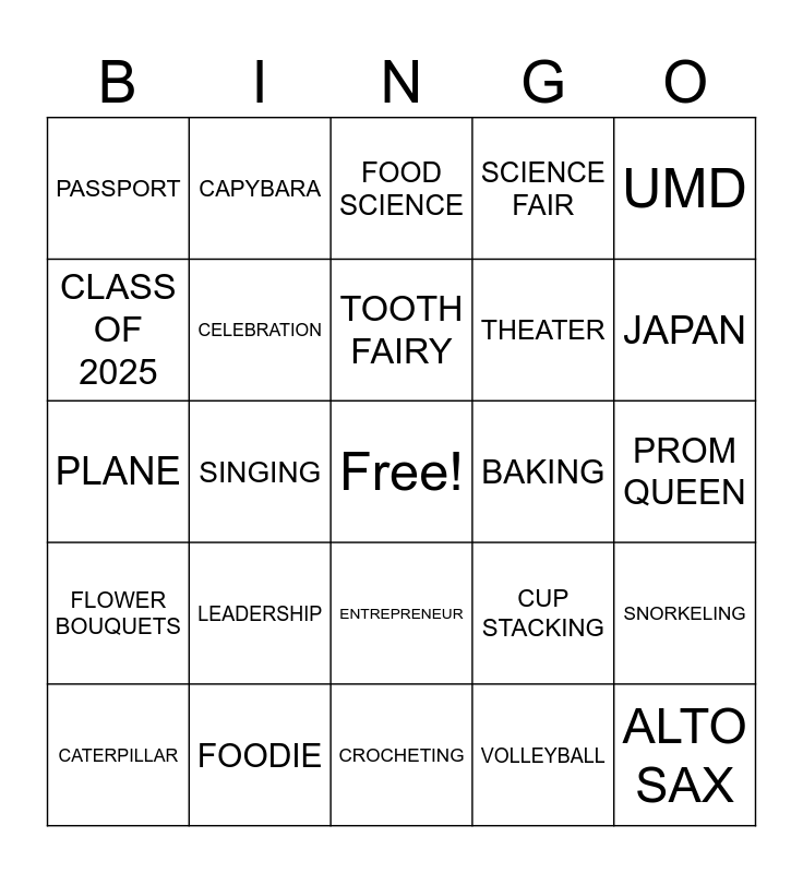 This bingo card has a free space and 24 words: LEADERSHIP, FOODIE, TOOTH FAIRY, CATERPILLAR, UMD, PASSPORT, CLASS OF 2025, CAPYBARA, BAKING, ENTREPRENEUR, THEATER, PLANE, CUP STACKING, SNORKELING, CELEBRATION, VOLLEYBALL, PROM QUEEN, FOOD SCIENCE, JAPAN, SINGING, ALTO SAX, FLOWER BOUQUETS, SCIENCE FAIR and CROCHETING.