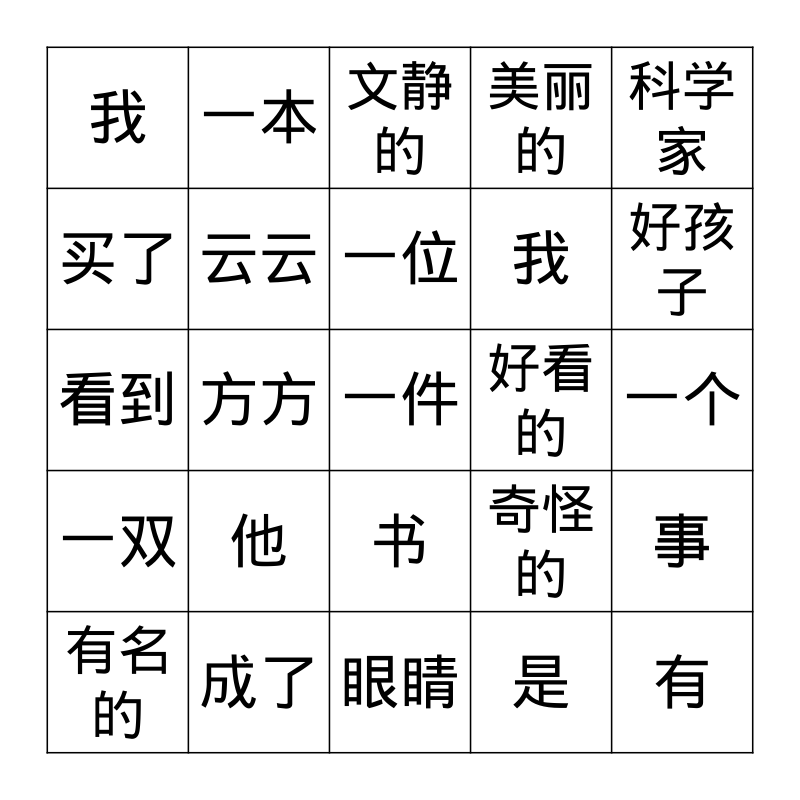 This bingo card has a free space and 24 words: 他, 成了, 一位, 有名的, 科学家, 我, 买了, 一本, 好看的, 书, 我, 看到, 奇怪的, 事, 云云, 是, 一个, 文静的, 好孩子, 方方, 有, 一双, 美丽的 and 眼睛.