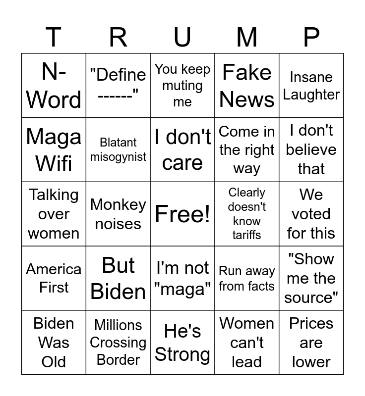 This bingo card has a free space and 24 words: But Biden, Millions Crossing Border, I don't care, Biden Was Old, Insane Laughter, N-Word, Maga Wifi, "Define ------", Clearly doesn't know tariffs, I'm not "maga", Come in the right way, Talking over women, Run away from facts, "Show me the source", Blatant misogynist, Women can't lead, We voted for this, You keep muting me, I don't believe that, Monkey noises, Prices are lower, America First, Fake News and He's Strong.
