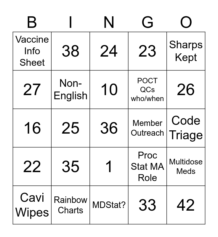 This bingo card has 90 words: Free!, Code Orange, 1, 2, Code Blue, 3, 4, Code Silver, 5, 6, Code Gray, 7, 8, Code Triage, 9, 10, Code Red, 11, 12, MDStat #, 13, 14, MDStat?, 15, 16, Rainbow Charts, 17, 18, PROMPT, 19, 20, Multidose Meds, 21, 22, Vaccine Info Sheet, 23, 24, Sani Wipes, 25, 26, Cavi Wipes, 27, 28, Proc Stat #, Proc Stat ?, Proc Stat MA Role, Proc Stat MD Role, Proc Stat Bag Loc., Proc Stat Box Loc., POCT Where, POCT What, POCT QCs who/when, PPE where?, Sterile Exp Date, Spill Kits, Terminal Clean, Member Outreach, Oxygen Administration, Appt Access Times, FTKA Process, Max Weight Scale, 29, 30, Needlestick Process, 31, 32, Who Steril. Instr., 33, 34, Evac. Site, 35, 36, Manual BPs? Who/Where, 37, 38, Non-English, 39, 40, Where Meds Kept, 41, 42, Sharps Kept, 43, 44, Fridge Temps, 45, 46, Oxygen Location, 47 and 48.