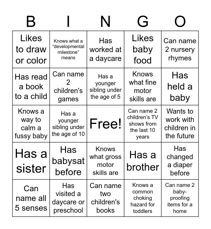 This bingo card has a free space and 24 words: Has babysat before, Has visited a daycare or preschool, Has a younger sibling under the age of 5, Can name all 5 senses, Can name 2 nursery rhymes, Likes to draw or color, Has read a book to a child, Knows what a “developmental milestone” means, Can name 2 children’s TV shows from the last 10 years, Knows what gross motor skills are, Knows what fine motor skills are, Knows a way to calm a fussy baby, Has a brother, Has changed a diaper before, Can name 2 children's games, Knows a common choking hazard for toddlers, Wants to work with children in the future, Has worked at a daycare, Has held a baby, Has a younger sibling under the age of 10, Can name 2 baby-proofing items for a home, Has a sister, Likes baby food and Can name two children's books.