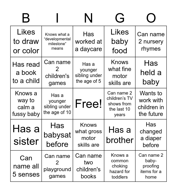 This bingo card has a free space and 24 words: Has babysat before, Can name 2 playground games, Has a younger sibling under the age of 5, Can name all 5 senses, Can name 2 nursery rhymes, Likes to draw or color, Has read a book to a child, Knows what a “developmental milestone” means, Can name 2 children’s TV shows from the last 10 years, Knows what gross motor skills are, Knows what fine motor skills are, Knows a way to calm a fussy baby, Has a brother, Has changed a diaper before, Can name 2 children's games, Knows a common choking hazard for toddlers, Wants to work with children in the future, Has worked at a daycare, Has held a baby, Has a younger sibling under the age of 10, Can name 2 baby-proofing items for a home, Has a sister, Likes baby food and Can name two children's books.