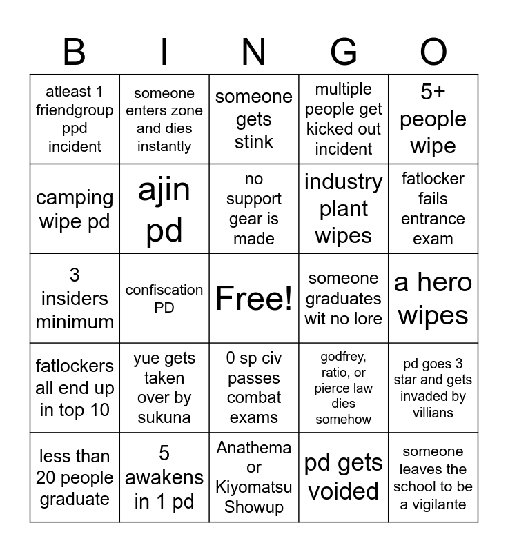 This bingo card has a free space and 24 words: yue gets taken over by sukuna, 5 awakens in 1 pd, no support gear is made, less than 20 people graduate, 5+ people wipe, atleast 1 friendgroup ppd incident, camping wipe pd, someone enters zone and dies instantly, someone graduates wit no lore, 0 sp civ passes combat exams, industry plant wipes, 3 insiders minimum, godfrey, ratio, or pierce law dies somehow, pd goes 3 star and gets invaded by villians, ajin pd, pd gets voided, a hero wipes, someone gets stink, fatlocker fails entrance exam, confiscation PD, someone leaves the school to be a vigilante, fatlockers all end up in top 10, multiple people get kicked out incident and Anathema or Kiyomatsu Showup.