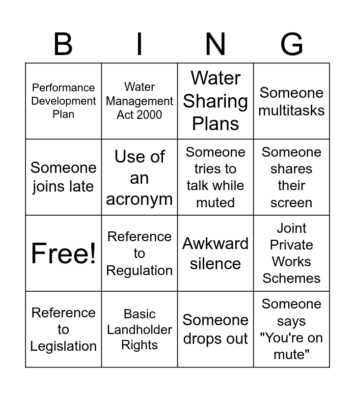 This bingo card has 20 words: Joint Private Works Schemes, Water Licensing System, Water Sharing Plans, Mandatory Conditions, Reference to Legislation, Someone joins late, Basic Landholder Rights, Performance Development Plan, Free!, Water Management Act 2000, Reference to Regulation, Awkward silence, Use of an acronym, Someone says "You're on mute", Someone tries to talk while muted, Someone says "Can you repeat that", Someone shares their screen, Someone multitasks, Someone drops out and Someone eats during meeting.