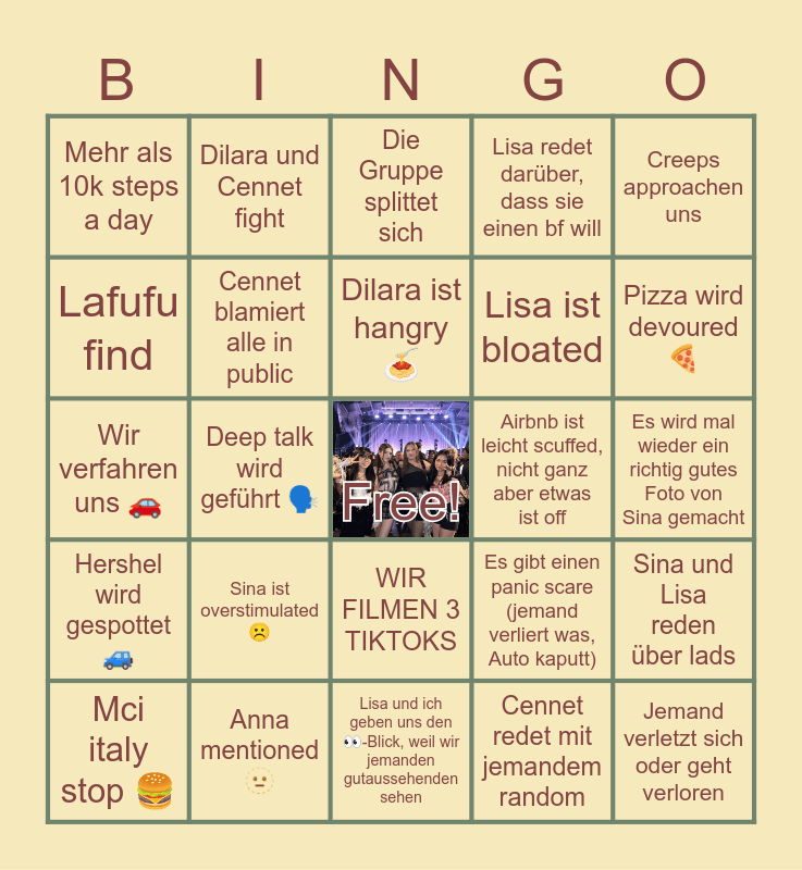 This bingo card has a free space and 24 words: Sina ist overstimulated☹️, Anna mentioned 🫥, Dilara ist hangry🍝, Mci italy stop 🍔, Creeps approachen uns, Mehr als 10k steps a day, Lafufu find, Dilara und Cennet fight, Airbnb ist leicht scuffed, nicht ganz aber etwas ist off, WIR FILMEN 3 TIKTOKS, Lisa ist bloated, Wir verfahren uns 🚗, Es gibt einen panic scare (jemand verliert was, Auto kaputt), Sina und Lisa reden über lads, Cennet blamiert alle in public, Cennet redet mit jemandem random, Es wird mal wieder ein richtig gutes Foto von Sina gemacht, Die Gruppe splittet sich, Pizza wird devoured 🍕, Deep talk wird geführt 🗣️, Jemand verletzt sich oder geht verloren, Hershel wird gespottet 🚙, Lisa redet darüber, dass sie einen bf will and Lisa und ich geben uns den 👀-Blick, weil wir jemanden gutaussehenden sehen.