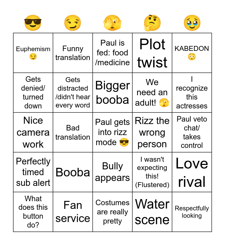 This bingo card has a free space and 24 words: Booba, Fan service, Bigger booba, What does this button do?, KABEDON 😳, Euphemism 😏, Gets denied/ turned down, Funny translation, Rizz the wrong person, Bully appears, We need an adult! 🫣, Nice camera work, I wasn't expecting this! (Flustered), Love rival, Gets distracted /didn't hear every word, Water scene, Paul veto chat/ takes control, Paul is fed: food /medicine, I recognize this actresses, Bad translation, Respectfully looking, Perfectly timed sub alert, Plot twist and Costumes are really pretty.