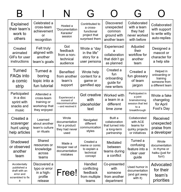 This bingo card has 51 words: Accidentally published a draft with an error and scrambled to fix it, Adjusted their workflow for another team, Advocated for their team’s priorities, Attended a cross-team training or workshop that they enjoyed, Benefited from another team’s support, Built a collaboration that turned into a long-term partnership, Celebrated a cross-team achievement or recognition, Co-presented with someone from another department, Collaborated with a team they had never worked with before, Collaborated with ACE teams for quirky projects or initiatives, Collaborated with support to write witty auto-replies, Contributed to a cross-functional project that surprised them, Created a fun glossary of team jargon, Created a fun onboarding guide for new writers, Created a meme or comic to explain a technical concept, Created a scavenger hunt using help articles, Created animated GIFs for user instructions, Designed a mascot or character for a help site, Discovered a typo or error in a high-profile release, Discovered unexpected common ground with another team, Experienced a collaboration that didn’t go as planned, Experienced a moment of miscommunication—and resolved it, Explained their team’s work to others, Felt truly aligned with another team’s goals, Free!, Got creative with placeholder text, Got feedback from a non-technical audience, Handled conflicting feedback from multiple teams, Helped in onboarding or training someone from a different team, Hosted a “Documentation Karaoke” session, Learned a new tool or process from another team, Learned about another team’s culture or rituals, Made a blooper reel of documentation mistakes, Mediated between teams during a conflict, Navigated different communication styles, Participated in a doc sprint with snacks and music, Participated in a joint brainstorming session that led to a breakthrough, Received unexpected praise from a developer, Shadowed or observed another team, Shared resources or knowledge across teams, Turned FAQs into a comic strip, Turned a boring topic into a fun tutorial, Turned a confusing feature into a clear user guide, Used humor in documentation (and got away with it), Worked with a team in a different time zone, Wrote a fake changelog for April Fool’s Day, Wrote a “day in the life” story for a user persona, Wrote documentation for a product they had never used, Wrote documentation in rhyme or haiku (just for fun!), Wrote help content for a game or gamified app and Wrote their first user guide or manual.