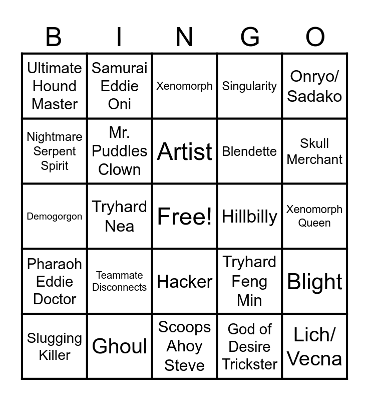 This bingo card has a free space and 109 words: Trapper, Wraith, Hillbilly, Nurse, Shape/ Michael Myers, Hag, Doctor, Cannibal/ Bubba/ Leatherface, Huntress, Nightmare/ Freddy Kruger, Pig/ Amanda Young, Clown, Spirit, Legion, Plague, Ghostface, Demogorgon, Oni, Deathslinger, Executioner/ Pyramid head, Blight, Twins (lol good luck getting this space), Trickster, Nemesis, Cenobite, Artist, Onryo/ Sadako, Dredge, Mastermind/ Albert Wesker, Knight, Skull Merchant, Singularity, Xenomorph, Good Guy/ Chucky, Unknown, Lich/ Vecna, Dark Lord/ Dracula, Hound master, Ghoul, Animatronic/ Springtrap, Bald Dwight, White Mask Meg, Blendette, Tryhard Nea, Tryhard Feng Min, Tryhard Lara Croft, Look-see Doctor, Mordeo Huntress, Jonathan Byers, Jabberwock Artist, Minotaur Oni, Tubarao, God of Desire Trickster, Were-Elk, Pixel Perfect Feng min, Alucard, Good Gal, Inoculated Xenomorph, Baba Yaga, Mr. Puddles Clown, Ultimate Hound Master, Half Spirits Torments Dredge, Miss Fuchi Artist, Tomie Spirit, Hunk, William Birkin, Claire Redfield, Chris Redfield, Sheva Alomar, Carlos Oliveira, Stranger Eddie Deathslinger, Samurai Eddie Oni, Pharaoh Eddie Doctor, Eddies Tribute Dredge, Rize Kamishiro Ghoul, Rain, Xenomorph Queen, Cybil Bennett, James Sunderland, Maria, Lisa Garland, Alessa Gillespie Cheryl, Geralt Of Rivia Vittorio, Leshen Artist, Yellow Rabbit, Glitchtrap, Boulet Artist, Daryl Dixon, Nightmare Serpent Spirit, Forest Guide Yui, Baby Killer, Teammate Disconnects, Killer Disconnects, Random Gets downed in less than 30 sec, Ross Crashes Out, Pearl Crashes Out, Sam Crashes Out, Bunny Feng, Scoops Ahoy Steve, Cracked Nancy, Wandering Cat Blight, Humped By Killer, Slugging Killer, Hacker, Brown Coat Rick, Brown Coat Leon, Hospital Gown Michael Myers, Hospital Gown Rick and Hit By Killer On Hook.
