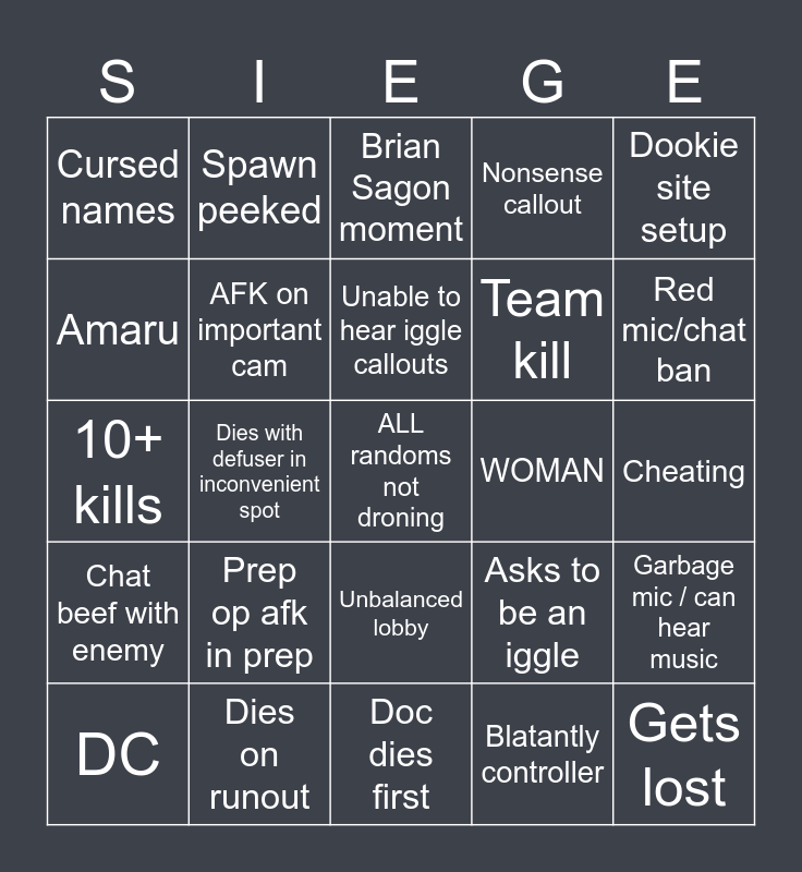 This bingo card has 46 words: ZERO comms, ALL randoms not droning, Doc player no stims, Doc dies first, Prep op afk in prep, Random op fragger, Spawn peeked, Counter spawn peeked, Amaru, Ash, AFK on important cam, Nonsense callout, Garbage mic / can hear music, Asks to be an iggle, All randoms die before iggles, Insulting, Unable to hear iggle callouts, WOMAN, No randoms in site in pivotal moment, Dookie site setup, Dies with defuser in inconvenient spot, Blatantly controller, Cursed names, Team kill, Awful ban, Red mic/chat ban, DC, Hear tiktok through mic, Unbalanced lobby, Chat beef with enemy, Roamer dies first, "EZ", "GN" / "goodnight", Chat spam, Man advantage lost (ie. 5v2 -> 2v2), Dies on runout, Cheating, Switches off of important op last second, Bad aim, Trivial error, Gets lost, Brian Sagon moment, 10+ kills, Decent comms, Clutches and Actually fun.