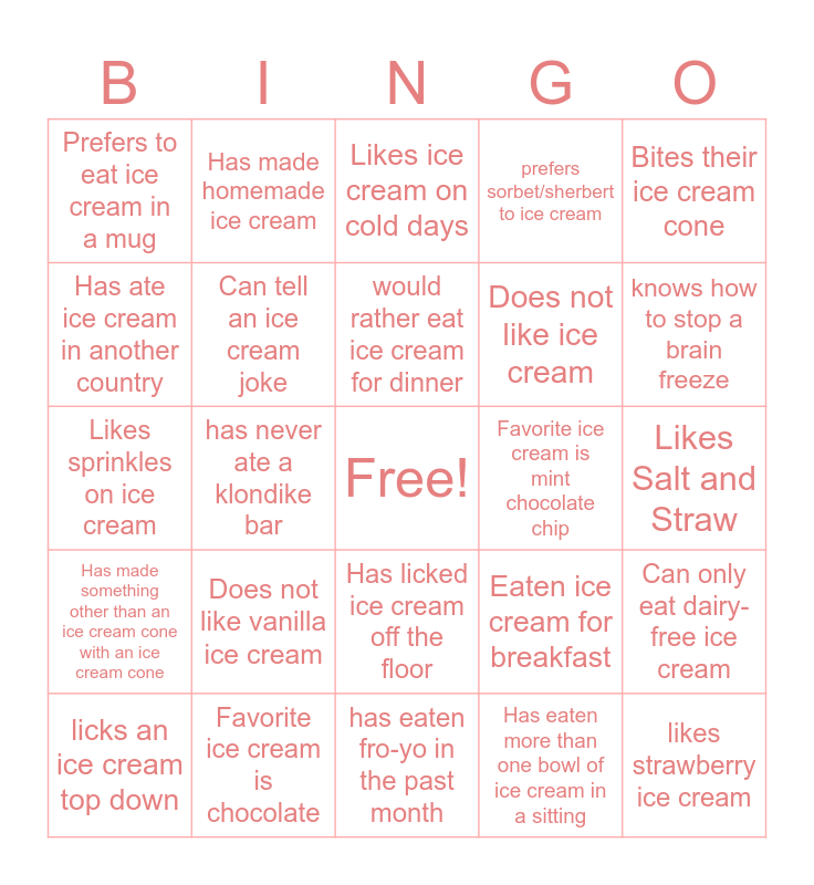 This bingo card has a free space and 24 words: Does not like vanilla ice cream, Favorite ice cream is chocolate, would rather eat ice cream for dinner, licks an ice cream top down, Bites their ice cream cone, Prefers to eat ice cream in a mug, Has ate ice cream in another country, Has made homemade ice cream, Favorite ice cream is mint chocolate chip, Has licked ice cream off the floor, Does not like ice cream, Likes sprinkles on ice cream, Eaten ice cream for breakfast, Can only eat dairy-free ice cream, Can tell an ice cream joke, Has eaten more than one bowl of ice cream in a sitting, Likes Salt and Straw, Likes ice cream on cold days, knows how to stop a brain freeze, has never ate a klondike bar, likes strawberry ice cream, Has made something other than an ice cream cone with an ice cream cone, prefers sorbet/sherbert to ice cream and has eaten fro-yo in the past month.