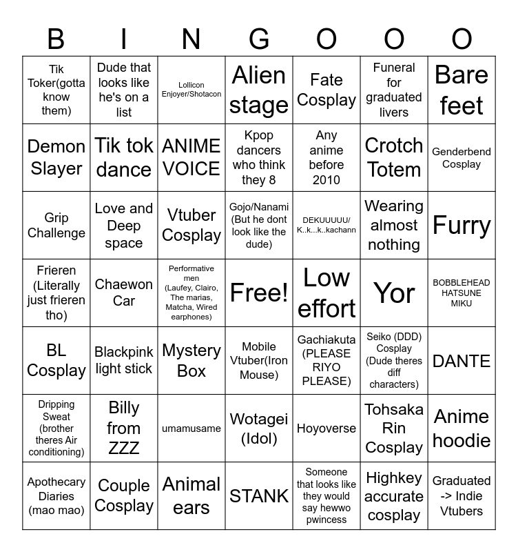 This bingo card has a free space and 48 words: Hoyoverse, Crotch Totem, STANK, Chaewon Car, Vtuber Cosplay, BOBBLEHEAD HATSUNE MIKU, Dude that looks like he's on a list, Couple Cosplay, Funeral for graduated livers, Mobile Vtuber(Iron Mouse), Bare feet, Alien stage, Wearing almost nothing, DEKUUUUU/ K..k...k..kachann, Dripping Sweat (brother theres Air conditioning), Yor, Demon Slayer, Genderbend Cosplay, Tohsaka Rin Cosplay, Fate Cosplay, Any anime before 2010, Performative men (Laufey, Clairo, The marias, Matcha, Wired earphones), Tik Toker(gotta know them), Tik tok dance, Anime hoodie, ANIME VOICE, Furry, Apothecary Diaries (mao mao), Gojo/Nanami (But he dont look like the dude), Love and Deep space, Highkey accurate cosplay, Low effort, DANTE, Billy from ZZZ, Frieren (Literally just frieren tho), Gachiakuta (PLEASE RIYO PLEASE), Seiko (DDD) Cosplay (Dude theres diff characters), Grip Challenge, Mystery Box, umamusame, BL Cosplay, Graduated -> Indie Vtubers, Lollicon Enjoyer/Shotacon, Animal ears, Kpop dancers who think they 8, Wotagei (Idol), Blackpink light stick and Someone that looks like they would say hewwo pwincess.
