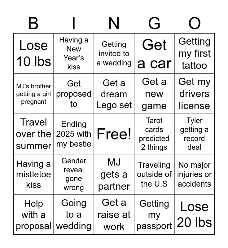 This bingo card has a free space and 24 words: Gender reveal gone wrong, Going to a wedding, Get a dream Lego set, Help with a proposal, Getting my first tattoo, Lose 10 lbs, MJ’s brother getting a girl pregnant, Having a New Year’s kiss, Tarot cards predicted 2 things, MJ gets a partner, Get a new game, Travel over the summer, Traveling outside of the U.S, No major injuries or accidents, Get proposed to, Getting my passport, Tyler getting a record deal, Getting invited to a wedding, Get my drivers license, Ending 2025 with my bestie, Lose 20 lbs, Having a mistletoe kiss, Get a car and Get a raise at work.