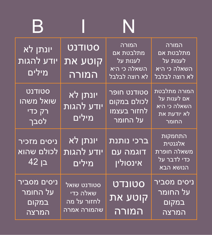 ⚠ This card has duplicate items: המורה מתלבטת אם לענות על השאלה כי היא לא רוצה לבלבל (2), ניסים מסביר על החומר במקום המרצה (2), יונתן לא יודע להגות מילים (3)