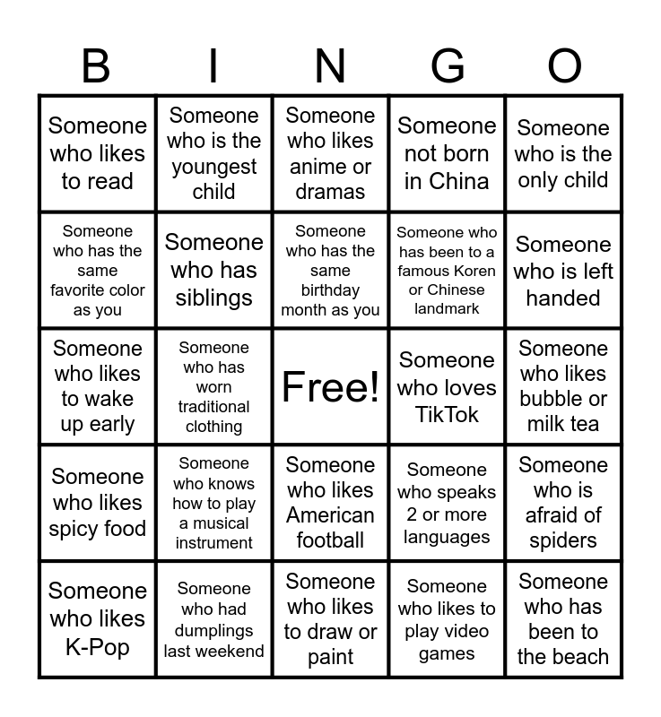 This bingo card has a free space and 24 words: Someone who knows how to play a musical instrument, Someone who had dumplings last weekend, Someone who has the same birthday month as you, Someone who likes K-Pop, Someone who is the only child, Someone who likes to read, Someone who has the same favorite color as you, Someone who is the youngest child, Someone who loves TikTok, Someone who likes American football, Someone who has been to a famous Koren or Chinese landmark, Someone who likes to wake up early, Someone who speaks 2 or more languages, Someone who is afraid of spiders, Someone who has siblings, Someone who likes to play video games, Someone who likes bubble or milk tea, Someone who likes anime or dramas, Someone who is left handed, Someone who has worn traditional clothing, Someone who has been to the beach, Someone who likes spicy food, Someone not born in China and Someone who likes to draw or paint.