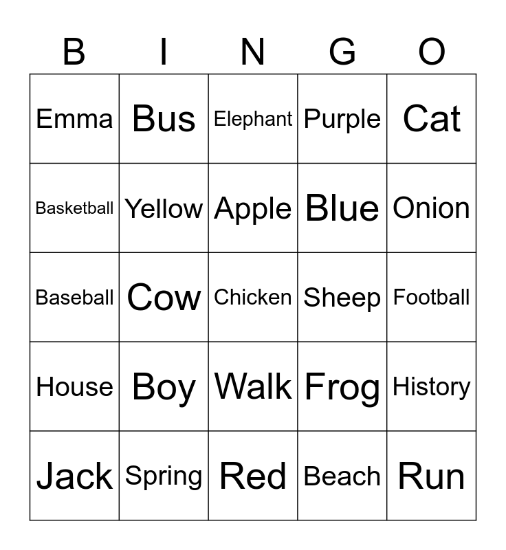 This bingo card has 56 words: Ryan, Jack, Adam, Emma, Red, Green, Yellow, Orange, Blue, Pink, Purple, Black, Free!, White, Brown, Dog, Cat, Cow, Pig, Chicken, Sheep, Turtle, Frog, Elephant, Banana, Apple, Potato, Burger, Onion, Cheese, Nutella, Beans, Eggs, Meat, Football, Basketball, Baseball, Car, House, Bus, Walk, Run, Pig, Cow, Girl, Boy, Spring, Summer, Winter, Autumn, Beach, Math, English, Arabic, History and Mango.