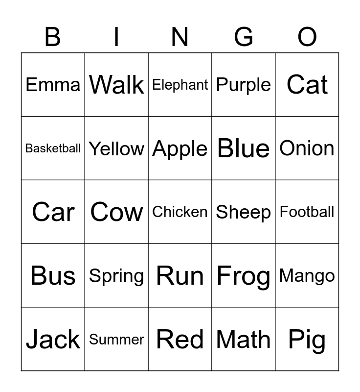 This bingo card has 57 words: Ryan, Jack, Adam, Emma, Red, Green, Yellow, Orange, Blue, Pink, Purple, Black, Free!, White, Brown, Dog, Cat, Cow, Pig, Chicken, Sheep, Turtle, Frog, Elephant, Banana, Apple, Potato, Burger, Onion, Cheese, Nutella, Beans, Eggs, Meat, Football, Basketball, Baseball, Car, House, Bus, Walk, Run, Pig, Cow, Girl, Boy, Spring, Summer, Winter, Autumn, Beach, Math, English, Arabic, History, Mango and Cow.