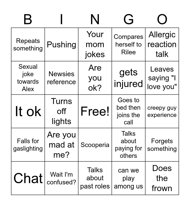 This bingo card has a free space and 24 words: Are you mad at me?, Wait I'm confused?, Are you ok?, Chat, Allergic reaction talk, Repeats something, Sexual joke towards Alex, Pushing, Goes to bed then joins the call, Scooperia, gets injured, It ok, Talks about paying for others, Forgets something, Newsies reference, can we play among us, creepy guy experience, Your mom jokes, Leaves saying "I love you", Turns off lights, Does the frown, Falls for gaslighting, Compares herself to Rilee and Talks about past roles.