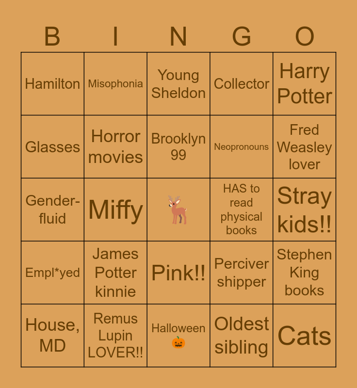 This bingo card has a free space and 24 words: James Potter kinnie, Remus Lupin LOVER!!, Brooklyn 99, House, MD, Harry Potter, Hamilton, Glasses, Misophonia, HAS to read physical books, Pink!!, Neopronouns, Gender-fluid, Perciver shipper, Stephen King books, Horror movies, Oldest sibling, Stray kids!!, Young Sheldon, Fred Weasley lover, Miffy, Cats, Empl*yed, Collector and Halloween 🎃.