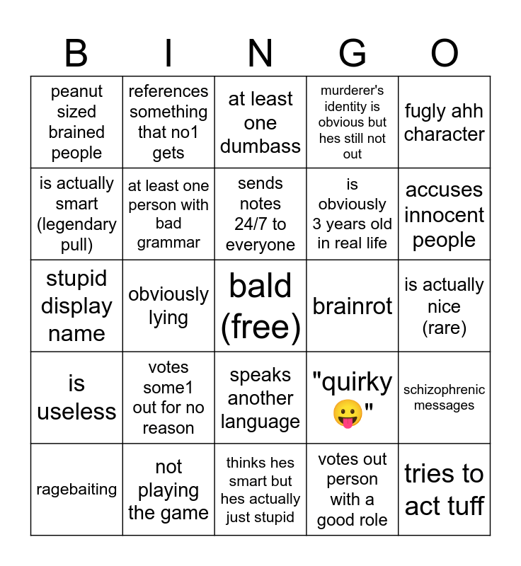 This bingo card has a free space and 29 words: ragebaiting, rude for no reason, obviously lying, fake nice, peanut sized brained people, at least one dumbass, at least one person with bad grammar, votes some1 out for no reason, brainrot, not playing the game, is actually nice (rare), tries to act tuff, thinks hes smart but hes actually just stupid, votes out person with a good role, accuses innocent people, teaming, speaks another language, is useless, fugly ahh character, stupid display name, "quirky😛", anger issues, is obviously 3 years old in real life, is actually smart (legendary pull), murderer's identity is obvious but hes still not out, references something that no1 gets, schizophrenic messages, sends notes 24/7 to everyone and is actually productive (SUPER LEGENDARY ULTRA RARE).