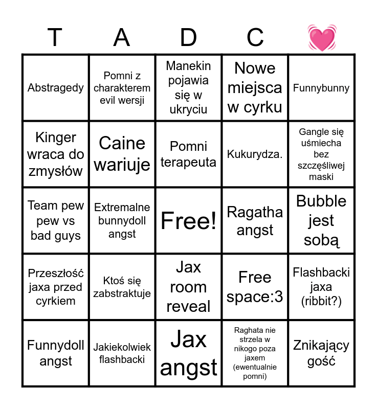 This bingo card has a free space and 25 words: Ktoś się zabstraktuje, Jax angst, Pomni terapeuta, Funnydoll angst, Funnybunny, Abstragedy, Kinger wraca do zmysłów, Pomni z charakterem evil wersji, Ragatha angst, Jax room reveal, Kukurydza., Team pew pew vs bad guys, Free space:3, Flashbacki jaxa (ribbit?), Caine wariuje, Żarty z podtekstami, Bubble jest sobą, Manekin pojawia się w ukryciu, Gangle się uśmiecha bez szczęśliwej maski, Extremalne bunnydoll angst, Znikający gość, Jakiekolwiek flashbacki, Przeszłość jaxa przed cyrkiem, Nowe miejsca w cyrku and Raghata nie strzela w nikogo poza jaxem (ewentualnie pomni).