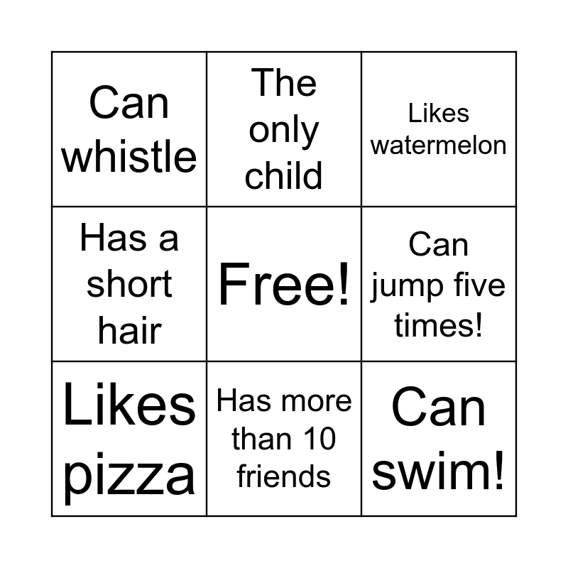 This bingo card has a free space and 8 words: Can jump five times!, Likes watermelon, The only child, Likes pizza, Can whistle, Can swim!, Has a short hair and Has more than 10 friends.