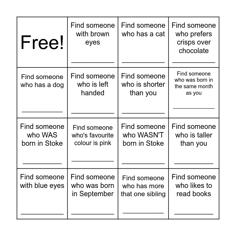 This bingo card has 16 words: Find someone with blue eyes ___________, Find someone who was born in September ___________, Find someone who has a cat ___________, Find someone who prefers crisps over chocolate ___________, Find someone who has a dog ___________, Find someone with brown eyes ___________, Find someone who WASN'T born in Stoke ___________, Find someone who is taller than you __________, Free!, Find someone who is left handed ___________, Find someone who has more that one sibling ___________, Find someone who was born in the same month as you ______________, Find someone who WAS born in Stoke __________, Find someone who's favourite colour is pink ____________, Find someone who is shorter than you ___________ and Find someone who likes to read books __________.