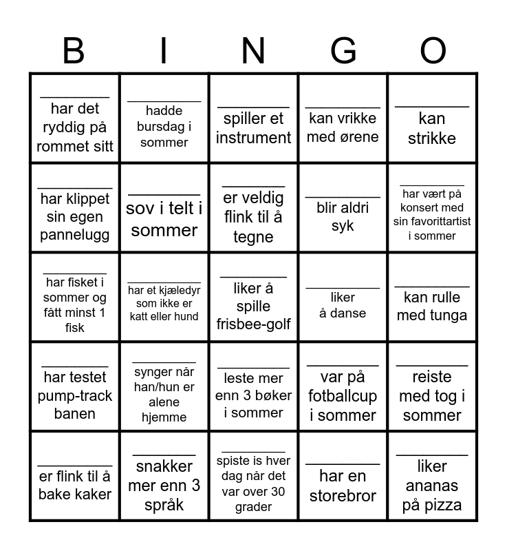 This bingo card has a free space and 24 words: _________ synger når han/hun er alene hjemme, _______ snakker mer enn 3 språk, _______ er veldig flink til å tegne, _________ er flink til å bake kaker, ________ kan strikke, ________ har det ryddig på rommet sitt, _________ har klippet sin egen pannelugg, __________ hadde bursdag i sommer, __________ liker å danse, _________ leste mer enn 3 bøker i sommer, _________ blir aldri syk, _________ har fisket i sommer og fått minst 1 fisk, ________ var på fotballcup i sommer, ________ reiste med tog i sommer, _______ sov i telt i sommer, ________ har en storebror, _________ kan rulle med tunga, ________ spiller et instrument, __________ har vært på konsert med sin favorittartist i sommer, ____________ har et kjæledyr som ikke er katt eller hund, ________ liker ananas på pizza, ________ har testet pump-track banen, _________ kan vrikke med ørene and _________ spiste is hver dag når det var over 30 grader.
