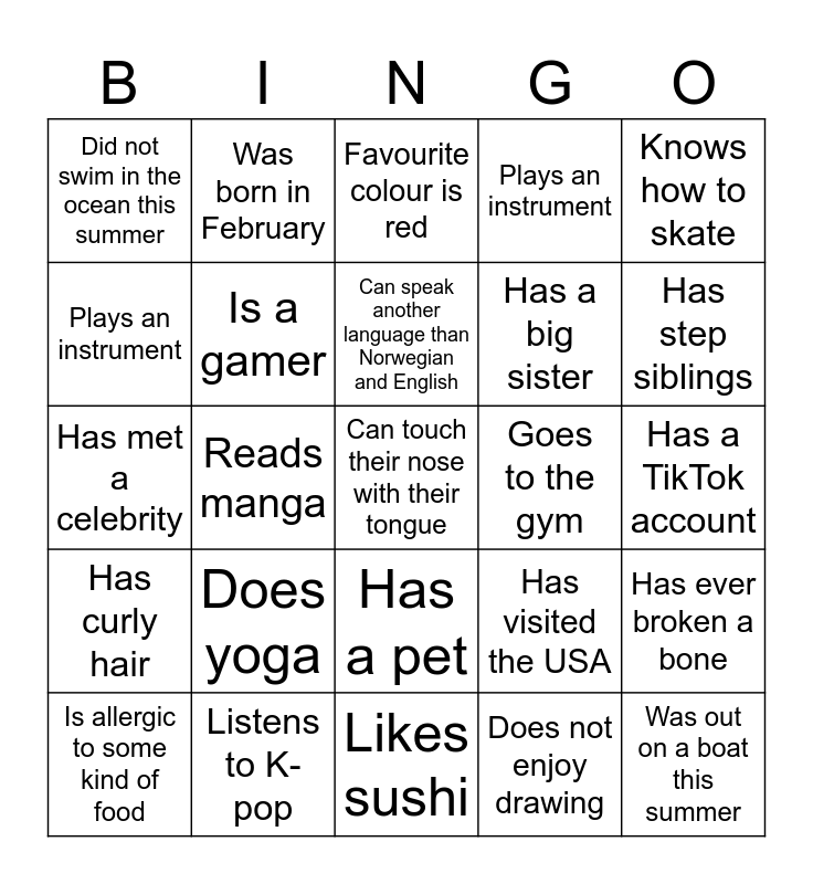 This bingo card has 25 words: Does yoga, Likes sushi, Can speak another language than Norwegian and English, Is allergic to some kind of food, Knows how to skate, Did not swim in the ocean this summer, Plays an instrument, Was born in February, Goes to the gym, Has a pet, Has a big sister, Has met a celebrity, Has visited the USA, Has ever broken a bone, Is a gamer, Was out on a boat this summer, Has a TikTok account, Favourite colour is red, Has step siblings, Reads manga, Can touch their nose with their tongue, Listens to K-pop, Has curly hair, Plays an instrument and Does not enjoy drawing.