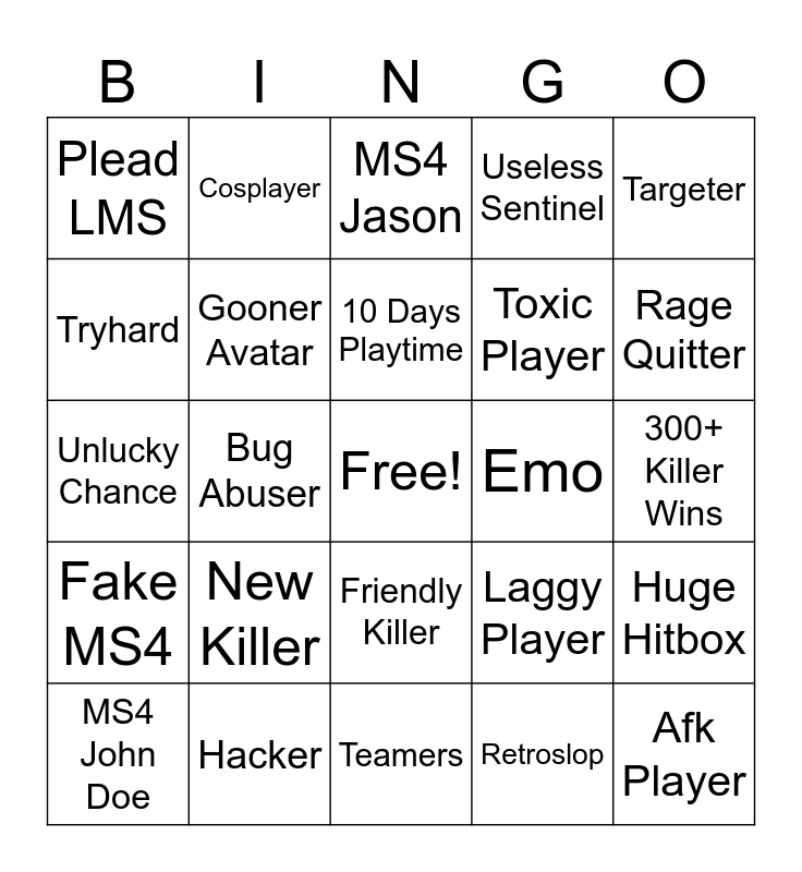 This bingo card has a free space and 24 words: MS4 John Doe, New Killer, 10 Days Playtime, Retroslop, Targeter, Plead LMS, Cosplayer, MS4 Jason, Emo, 300+ Killer Wins, Unlucky Chance, Gooner Avatar, Laggy Player, Huge Hitbox, Tryhard, Hacker, Teamers, Useless Sentinel, Rage Quitter, Fake MS4, Bug Abuser, Friendly Killer, Toxic Player and Afk Player.