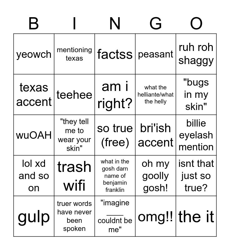 This bingo card has a free space and 24 words: trash wifi, truer words have never been spoken, am i right?, gulp, ruh roh shaggy, yeowch, texas accent, mentioning texas, bri'ish accent, what in the gosh darn name of benjamin franklin, what the helliante/what the helly, wuOAH, oh my goolly gosh!, isnt that just so true?, teehee, omg!!, billie eyelash mention, factss, "bugs in my skin", "they tell me to wear your skin", the it, lol xd and so on, peasant and "imagine ____ couldnt be me".