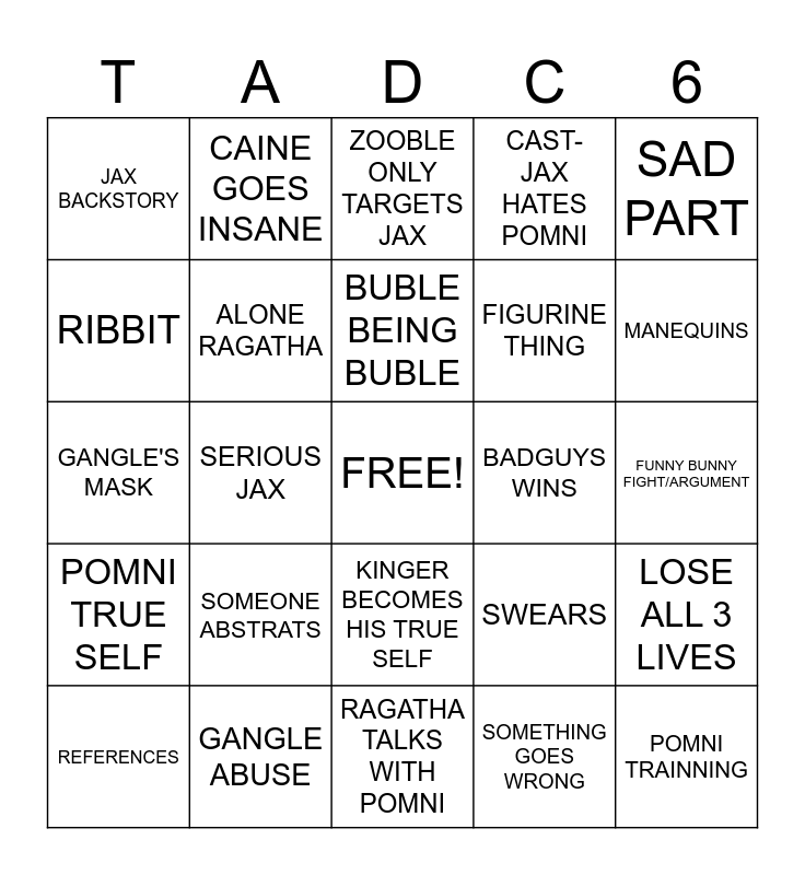 This bingo card has a free space and 24 words: SOMEONE ABSTRATS, GANGLE ABUSE, BUBLE BEING BUBLE, REFERENCES, SAD PART, JAX BACKSTORY, RIBBIT, CAINE GOES INSANE, BADGUYS WINS, KINGER BECOMES HIS TRUE SELF, FIGURINE THING, GANGLE'S MASK, SWEARS, LOSE ALL 3 LIVES, ALONE RAGATHA, SOMETHING GOES WRONG, FUNNY BUNNY FIGHT/ARGUMENT, ZOOBLE ONLY TARGETS JAX, MANEQUINS, SERIOUS JAX, POMNI TRAINNING, POMNI TRUE SELF, CAST-JAX HATES POMNI and RAGATHA TALKS WITH POMNI.