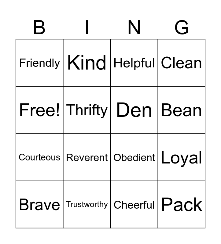 This bingo card has 16 words: Trustworthy, Loyal, Helpful, Friendly, Courteous, Kind, Obedient, Cheerful, Free!, Thrifty, Brave, Clean, Reverent, Bean, Den and Pack.