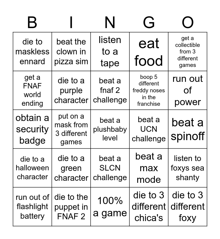 This bingo card has a free space and 24 words: die to a green character, die to the puppet in FNAF 2, beat a fnaf 2 challenge, run out of flashlight battery, get a collectible from 3 different games, die to maskless ennard, get a FNAF world ending, beat the clown in pizza sim, beat a UCN challenge, beat a SLCN challenge, boop 5 different freddy noses in the franchise, obtain a security badge, beat a max mode, listen to foxys sea shanty, die to a purple character, die to 3 different chica's, beat a spinoff, listen to a tape, run out of power, put on a mask from 3 different games, die to 3 different foxy, die to a halloween character, eat food and 100% a game.