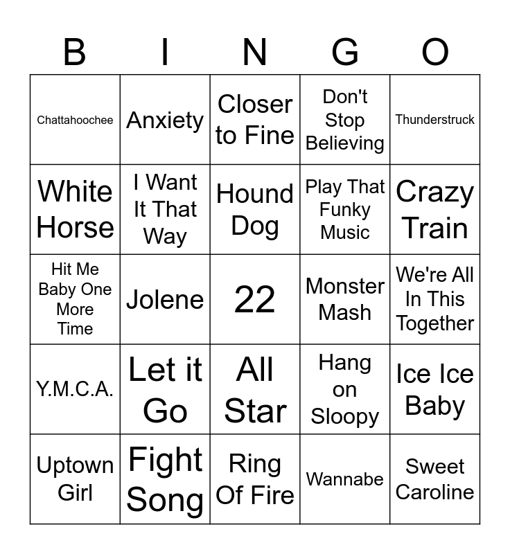 This bingo card has a free space and 24 words: Let it Go, Fight Song, Hound Dog, Uptown Girl, Thunderstruck, Chattahoochee, White Horse, Anxiety, Monster Mash, All Star, Play That Funky Music, Hit Me Baby One More Time, Hang on Sloopy, Ice Ice Baby, I Want It That Way, Wannabe, We're All In This Together, Closer to Fine, Crazy Train, Jolene, Sweet Caroline, Y.M.C.A., Don't Stop Believing and Ring Of Fire.