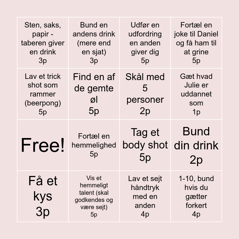 This bingo card has 20 words: Bund din drink 2p, Byt rundt på to glas uden de opdager det 4p, Udfør en udfordring en anden giver dig 5p, Tag et shot 2p, Få et kys 3p, Lav et trick shot som rammer (beerpong) 5p, Vis et hemmeligt talent (skal godkendes og være sejt) 5p, Sten, saks, papir - taberen giver en drink 3p, Free!, Bund en andens drink (mere end en sjat) 3p, Fortæl en hemmelighed 5p, Tag et body shot 5p, Find en af de gemte øl 5p, 1-10, bund hvis du gætter forkert 4p, Skål med 5 personer 2p, Fortæl en pinlig drukhistorie 4p, Gæt hvad Julie er uddannet som 1p, Fortæl en joke til Daniel og få ham til at grine 5p, Lav et sejt håndtryk med en anden 4p and Giv Nora en snack 4p.