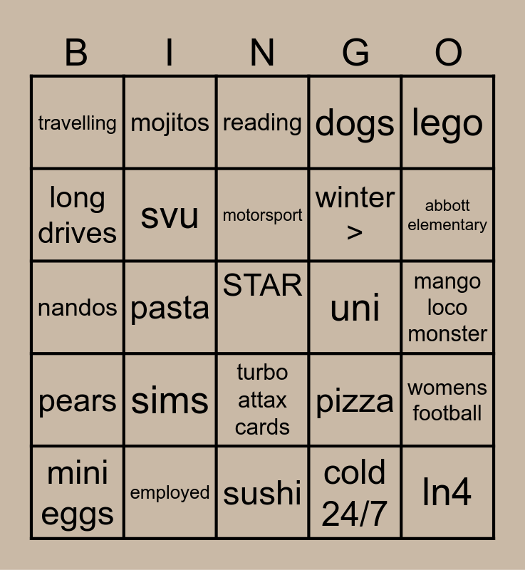 This bingo card has a free space and 24 words: sims, employed, motorsport, mini eggs, lego, travelling, long drives, mojitos, uni, turbo attax cards, winter >, nandos, pizza, womens football, svu, cold 24/7, mango loco monster, reading, abbott elementary, pasta, ln4, pears, dogs and sushi.