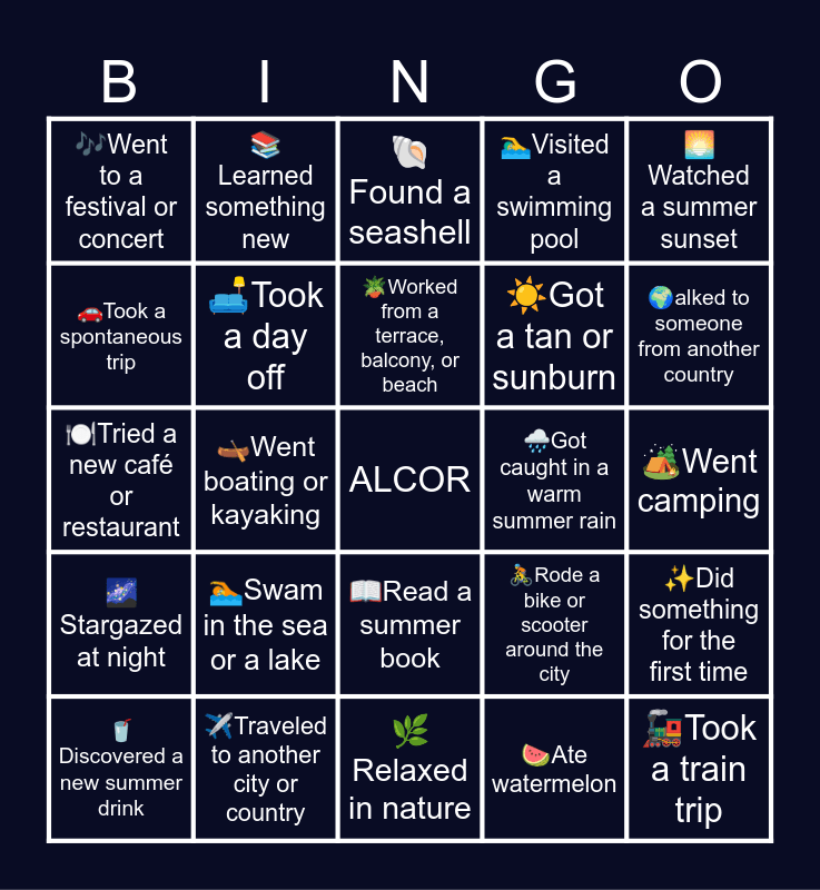This bingo card has a free space and 24 words: 🏊Swam in the sea or a lake, ✈️Traveled to another city or country, 🪴Worked from a terrace, balcony, or beach, 🥤Discovered a new summer drink, 🌅Watched a summer sunset, 🎶Went to a festival or concert, 🚗Took a spontaneous trip, 📚Learned something new, 🌧Got caught in a warm summer rain, 📖Read a summer book, ☀️Got a tan or sunburn, 🍽Tried a new café or restaurant, 🚴Rode a bike or scooter around the city, ✨Did something for the first time, 🛋Took a day off, 🍉Ate watermelon, 🏕Went camping, 🐚Found a seashell, 🌍alked to someone from another country, 🛶Went boating or kayaking, 🚂Took a train trip, 🌌Stargazed at night, 🏊♂️Visited a swimming pool and 🌿Relaxed in nature.
