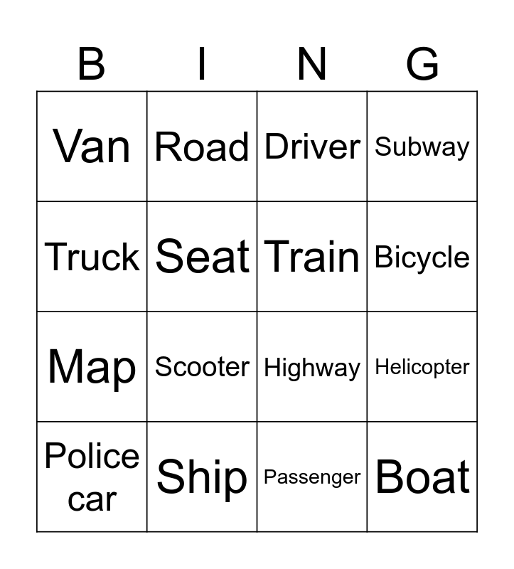This bingo card has 36 words: Car Bus Train Plane Boat Bicycle Motorcycle Truck Taxi Helicopter Subway Tram ShipScooter Van Ambulane Fire truck Poice car Driver Passenger Ticket Station Airport Harbor Road Highway Traffic Map Journey Travel Destination, Car, Bus, Train, Plane, Boat, Bicycle, Motorcycle, Truck, Taxi, Helicopter, Subway, Tram, Ship, Scooter, Van, Ambulance, Fire truck, Police car, Driver, Passenger, Ticket, Station, Airport, Harbor, Road, Highway, Traffic, Map, Seat, Wheel, Engine, Fuel, Speed, Safety and Luggage.