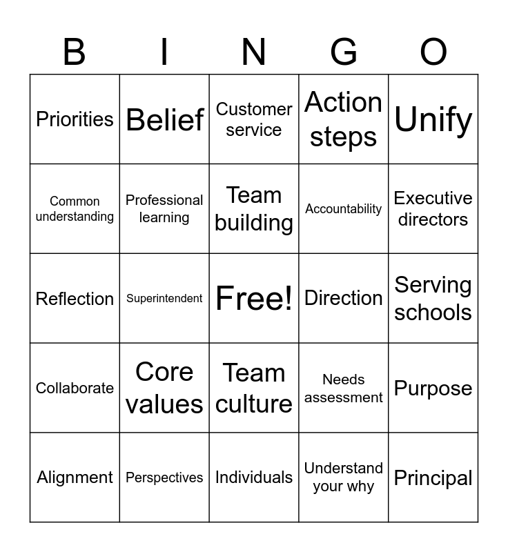 This bingo card has a free space and 25 words: Core values, Individuals, Team building, Alignment, Unify, Priorities, Common understanding, Belief, Direction, Team culture, Accountability, Reflection, Needs assessment, Purpose, Professional learning, Understanding, Serving schools, Customer service, Executive directors, Superintendent, Principal, Perspectives, Collaborate, Action steps and Understand your why.