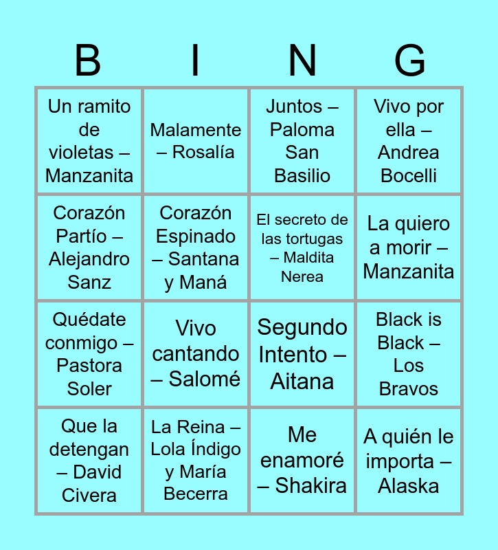 This bingo card has 50 words: Rosas – La Oreja de Van Gogh, Que la detengan – David Civera, Still Luvin – Delaossa y Quevedo, Corazón latino – David Bisbal, Bésame – Alejandro Sanz y Shakira, Sin miedo a nada – Álex Ubago, Malamente – Rosalía, La bicicleta – Carlos Vives y Shakira, Corazón Espinado – Santana y Maná, Entre dos tierras – Héroes del Silencio, El secreto de las tortugas – Maldita Nerea, Vivo por ella – Andrea Bocelli, Y cómo es él – José Luis Perales, Europe’s Living a Celebration – Rosa López, La Macarena – Los del Río, Colgando en tus manos – Carlos Baute y Marta Sánchez, La quiero a morir – Manzanita, La Reina – Lola Índigo y María Becerra, Tamo Bien – Enrique Iglesias y Pitbull, Corazón Partío – Alejandro Sanz, Black is Black – Los Bravos, Bamboleo – Gipsy Kings, Un ramito de violetas – Manzanita, Quédate conmigo – Pastora Soler, Fiebre – Bad Gyal, Torero – Chayanne, Vivo cantando – Salomé, Mediterráneo – Joan Manuel Serrat, Juntos – Paloma San Basilio, YO y TÚ - Ovy On The Drums, La flaca – Jarabe de Palo, Me gustas tú – Manu Chao, Aprendiz – Malú, 6 de Febrero – Aitana, El sol no regresa – La 5ª Estación, Ya No Te Hago Falta – Sen Senra y Ed Maverick, Despacito – Luis Fonsi, Bailar pegados – Sergio Dalma, La raja de tu falda – Estopa, Me enamoré – Shakira, Labios compartidos – Maná, El sol no regresa – La 5ª Estación, Aserejé – Las Ketchup, Se acabó – María Jiménez, Bailando – Enrique Iglesias, Segundo Intento – Aitana, SOLEAO – Myke Towers y Quevedo, La gata bajo la lluvia – Rocío Dúrcal, A quién le importa – Alaska and Eres tú – Mocedades.