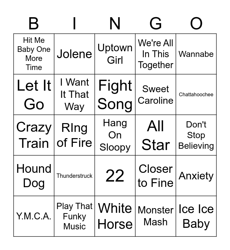 This bingo card has a free space and 24 words: Thunderstruck, Play That Funky Music, Fight Song, Y.M.C.A., Wannabe, Hit Me Baby One More Time, Let It Go, Jolene, All Star, 22, Sweet Caroline, Crazy Train, Closer to Fine, Anxiety, I Want It That Way, Monster Mash, Don't Stop Believing, Uptown Girl, Chattahoochee, RIng of Fire, Ice Ice Baby, Hound Dog, We're All In This Together and White Horse.