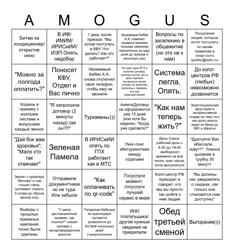 This bingo card has 36 words: Госуслуги момент: госуслуги лучший сервис в мире, "Как оплачивать по qr-code", ИНН плательщика/другие нужные сведения не прикрепили, "Можно за полгода оплатить?", "Дай бок вам здоровья"; "Мало кто так отвечает", Анкета/Договор не оформляются уже 15 дней (или хотя бы неделю). "Когда уже сделаете?", Поносят КФУ, Отдел и Вас лично, Татарская бабушка из краснодара пытается дозвонится до ИУЭиФ несколько дней (+аналогичное), Вопросы по заселению в общежитие (но это не к нам), Колл-центр РФ приходит и говорит, что мы вы просто так шлёте к ним людей, До колл-центров РФ (любых) невозможно дозвонится, Увожаемый Бибик А.А. поменял правила приемки посреди кампании (желательно за пару дней до приказа и несколько раз), "Вы должны нас уведомлять о скидках, как только они становятся нам доступны", "Я запросила договор (2 минуты назад) где он?!!", Не сдал одно ЕГЭ и получил договор, оплатил после чего в день приказа пытаешься узнать почему не зачислен (вопросы к приемке, это они недосмострели), Битва за кондиционер/открытое окно, Звонят с крейсера "Москва" и там глушат связь (успевают сказать 3 слова до сброса звонка итд), "Как нам теперь жить?", Ходишь в приемку с жухлыми листами и вопросами каждый звонок, 1 день после приказа: "Мы хотим поступать в КФУ. Что делать? Как это работает?", Туркмены))), Зеленая Памела, Пинг-понг абитуриентами между отделами, В ИРИСиИИ опять по ГПХ работают как в МТС, День Сурка: рабочий день с 8:30 до 18:00 свободного времени на всё около трех часов, если высыпаться, В ИФ/ИМИМ/ИРИСиИИ/ИЭП Опять недобор, Система легла. Опять., "У меня дистанционный экзамен. где ссылка?" сказал человек с неподтвержденной анкетой, Увожаемый Бибик А.А. снова отключил свой телефон, чтобы ему не звонили, Посылание людей, которые хотят поступать по своим правилам в спорт-лото (public@kpfu.ru), Выгорание))), Выводы с прошлых приемных кампаний точно были сделаны, "Дратуйте! Вас абассали... зовут?": Томное дыхание в трубку 30 минут+, Экзистенциальная фрустация в экспррессивной стадии на тему того, как долго деньги ходят из банка до КФУ и обратно, Отправили документ\чеки но не туда. Или забыли and Обед третьей сменой.