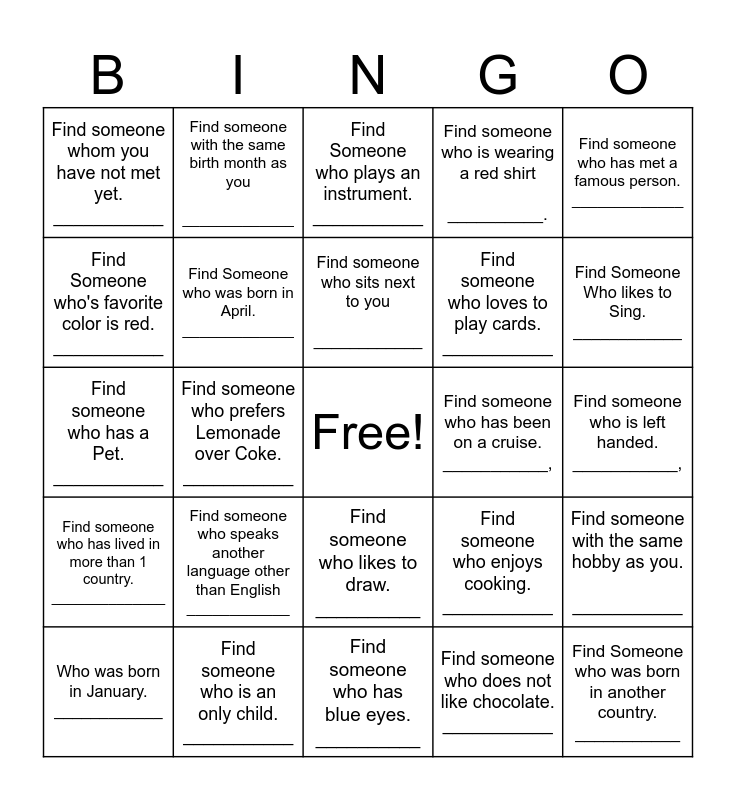 This bingo card has a free space and 29 words: Who was born in January. ____________, Find someone who has more than 2 siblings. ___________, Find someone who prefers Lemonade over Coke. ___________, Find someone who is shorter than you. _____________, Find someone whom you have not met yet. ___________, Find Someone who plays an instrument. ___________, Find Someone who was born in April. _____________, Find someone who speaks another language other than English ____________, Find someone who has been on a cruise. ___________,, Find someone who is an only child. ___________, Find someone who is left handed. ___________,, Find Someone who was born in another country. ___________, Find someone who has blue eyes. __________, Find someone who does not like chocolate. ___________, Find Someone Who likes to Sing. ____________, Find Someone who likes cats. __________, Find someone who likes to draw. __________, Find someone who has lived in more than 1 country. ______________, Find someone who has met a famous person. _____________, Find someone who has a Pet. ___________, Find someone who enjoys cooking. ___________, Find someone who was born in the same month as you. ___________, Find someone who loves to play cards. ___________, Find Someone who's favorite color is red. ___________, Find someone who is wearing a red shirt __________., Find someone with the same birth month as you _____________, Find someone with the same hobby as you. ___________, Find someone who sits next to you ____________ and Find someone who is wearing a blue shirt. ____________..