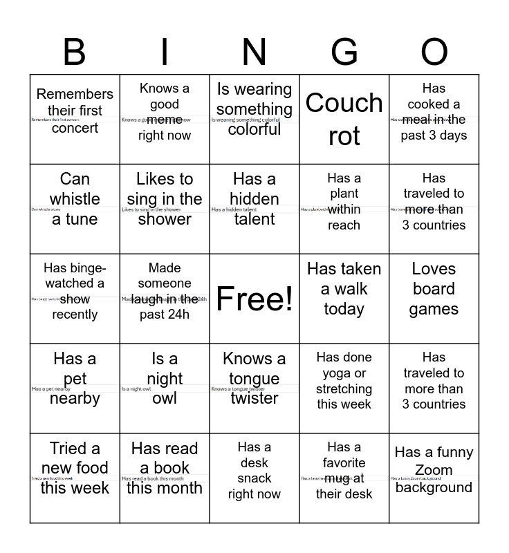This bingo card has 18 images, a free space and 24 words: Tried a new food this week, Is a night owl, Has a hidden talent, Has a favorite mug at their desk, Has cooked a meal in the past 3 days, Remembers their first concert, Knows a good meme right now, Is wearing something colorful, Has taken a walk today, Loves board games, Has binge-watched a show recently, Likes to sing in the shower, Has done yoga or stretching this week, Has traveled to more than 3 countries, Can whistle a tune, Has read a book this month, Has a desk snack right now, Couch rot, Has traveled to more than 3 countries, Has a pet nearby, Made someone laugh in the past 24h, Knows a tongue twister, Has a plant within reach and Has a funny Zoom background.